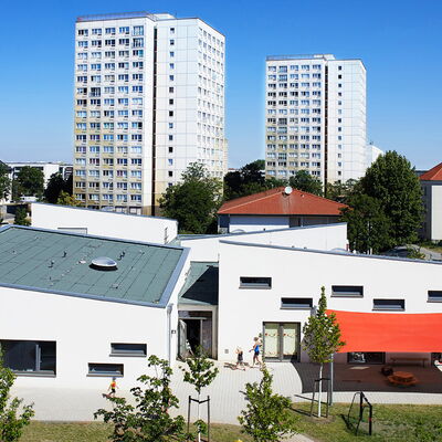Die KITA-Johannesfeld wurde als Werkstatt für Kinder geplant: Hier kann sich das freie Spiel entwickeln, das Fühlen, die Motorik, die Fantasie sowie die Kreativität der Kinder gefördert werden. Innerhalb des vorgegebenen Baufeldes entfaltet sich der Baukörper mit 4 in der Höhe gestaffelten und in der Dachform dreidimensional geschrägten Kuben. Aus dem eingeschossigen Volumen der Erschließungsfläche brechen die Familieneinheiten horizontal wie vertikal mit gestapelten Ebenen aus.