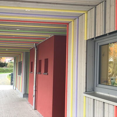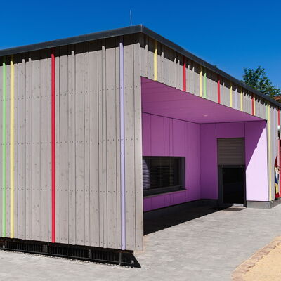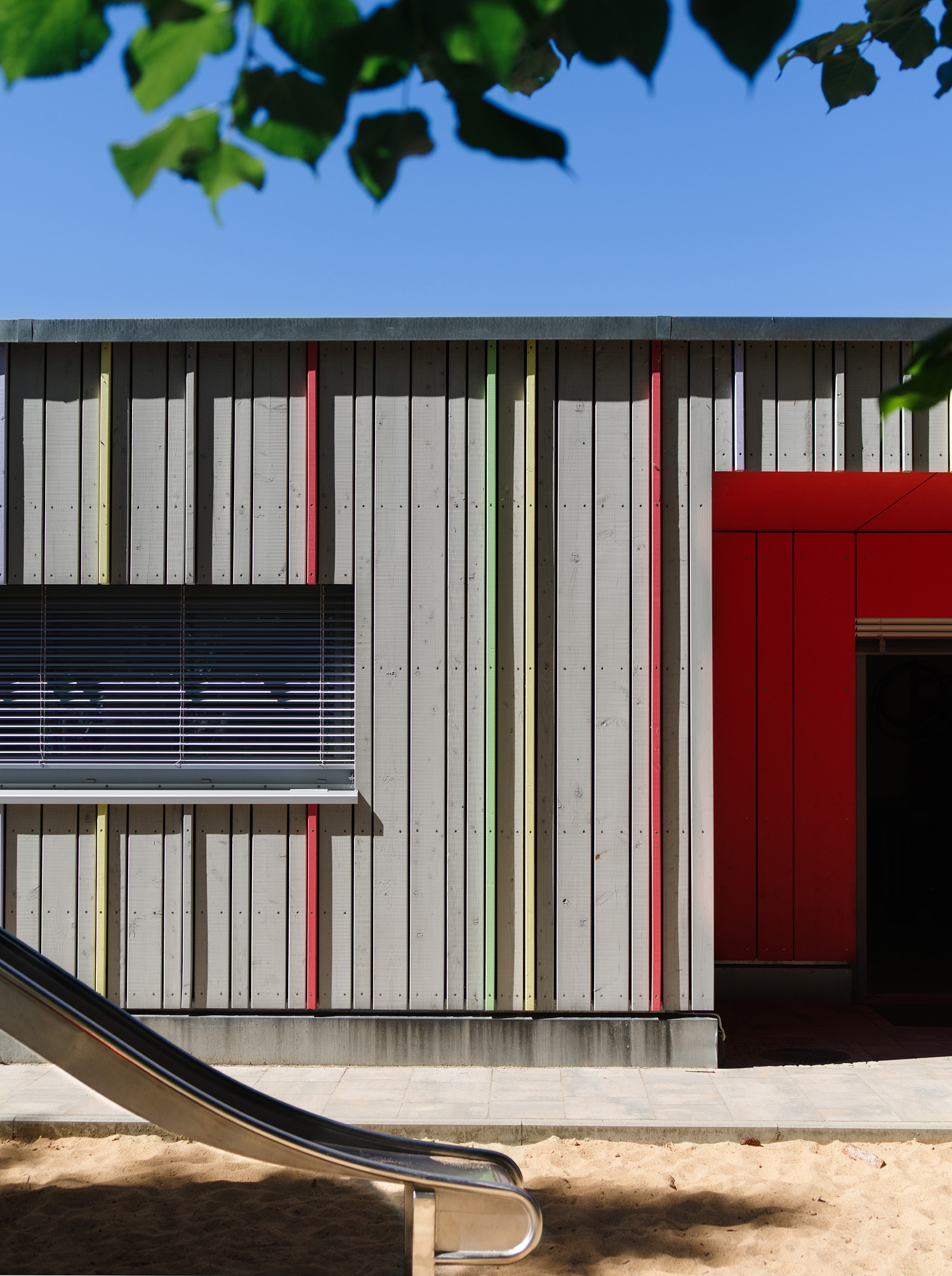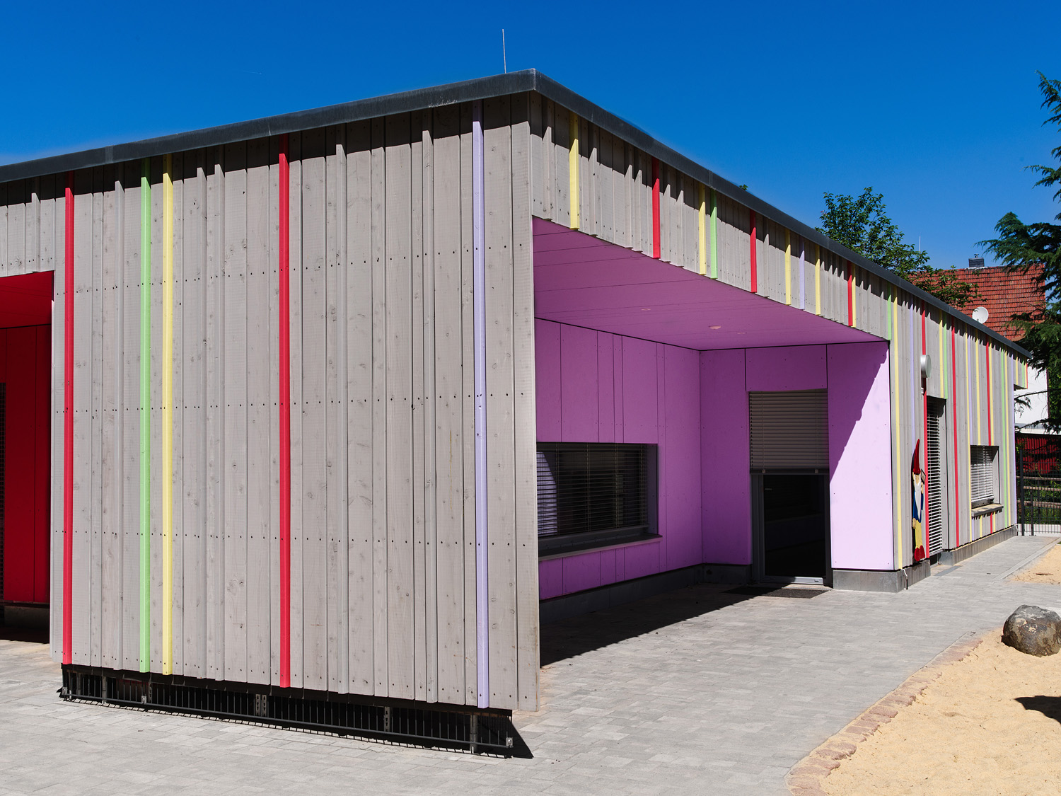 Der Kindergarten ersetzt den Vorgängerbau aus den 1930er Jahren, der aufgrund der heutigen statischen Anforderungen nicht mehr erweiterbar war. Der eingeschossige Neubau unterteilt sich in einen Gruppenraum für die Kindergrippe und 3 Gruppenräumen für den Kindergarten, mit jeweils eigenem Zugang.