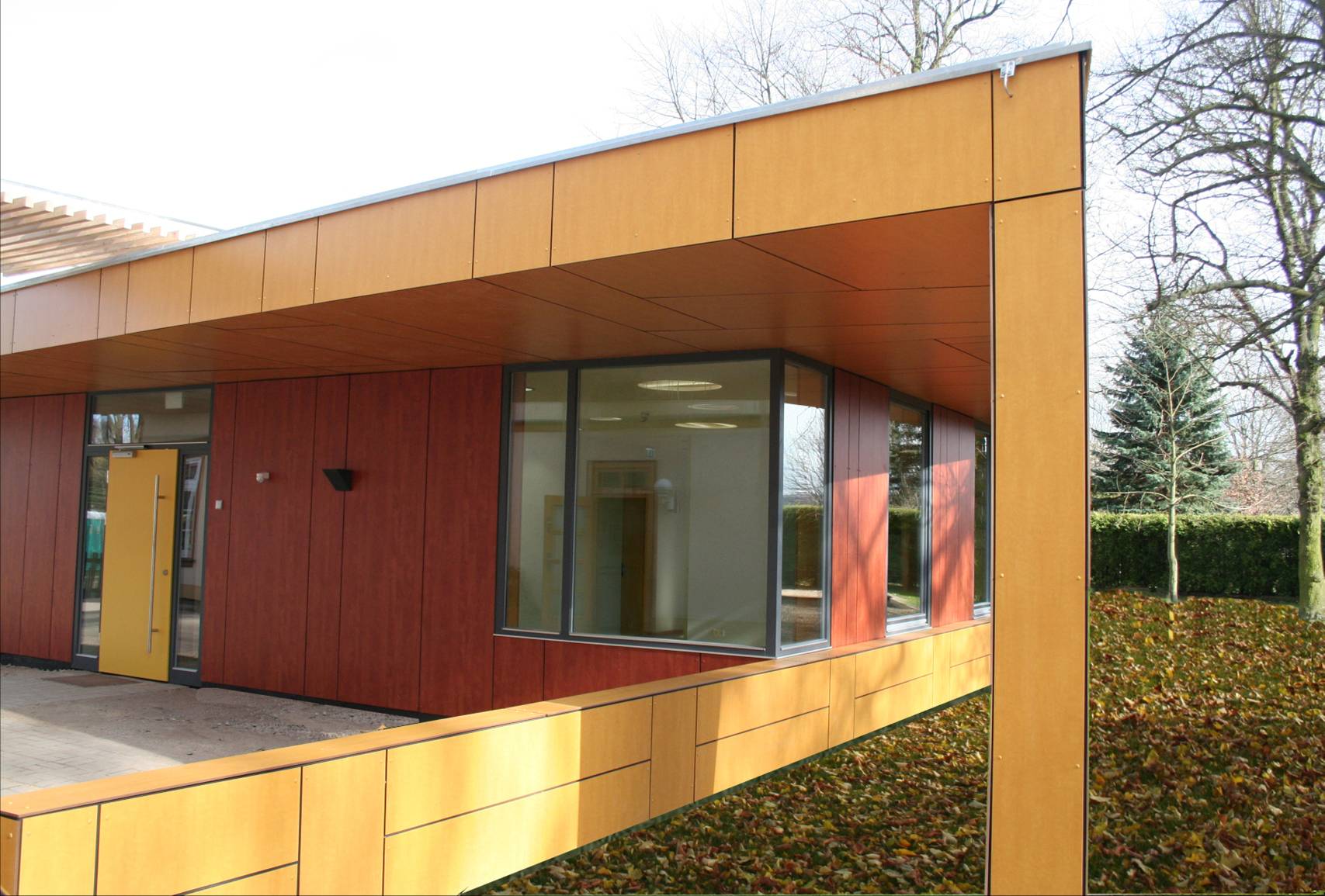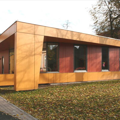 In Anlehnung an die Bauvorgaben Fröbels entwickelt sich das Gebäude aus einem schlichten Kubus (Würfel). Durch die spielerische Auflösung der streng logischen Form des Kubus entsteht eine neue Form des Zusammenwirkens des Baukörpers, in der die Kinder neue Bedingungen, Beziehungen und Relationen entdecken können.