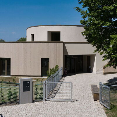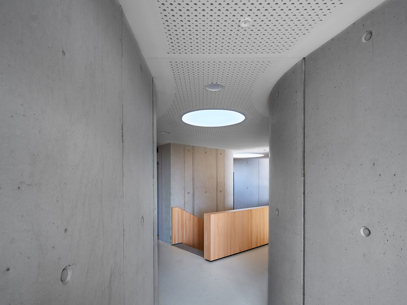 Der frei geschwungene Baukörper ist identitätsstiftend und ein kraftvoller Abschluss der umgebenden Wohnbebauung. Gleichzeitig liegt er, fließend eingebunden mit den Funktionen der Freibereiche, in dem sich öffnenden Grünzug. Der großzügige Windfangbereich ist Ankunftsort, Marktplatz und Verteiler, zentral als Auftakt des Gebäudes gelegen.