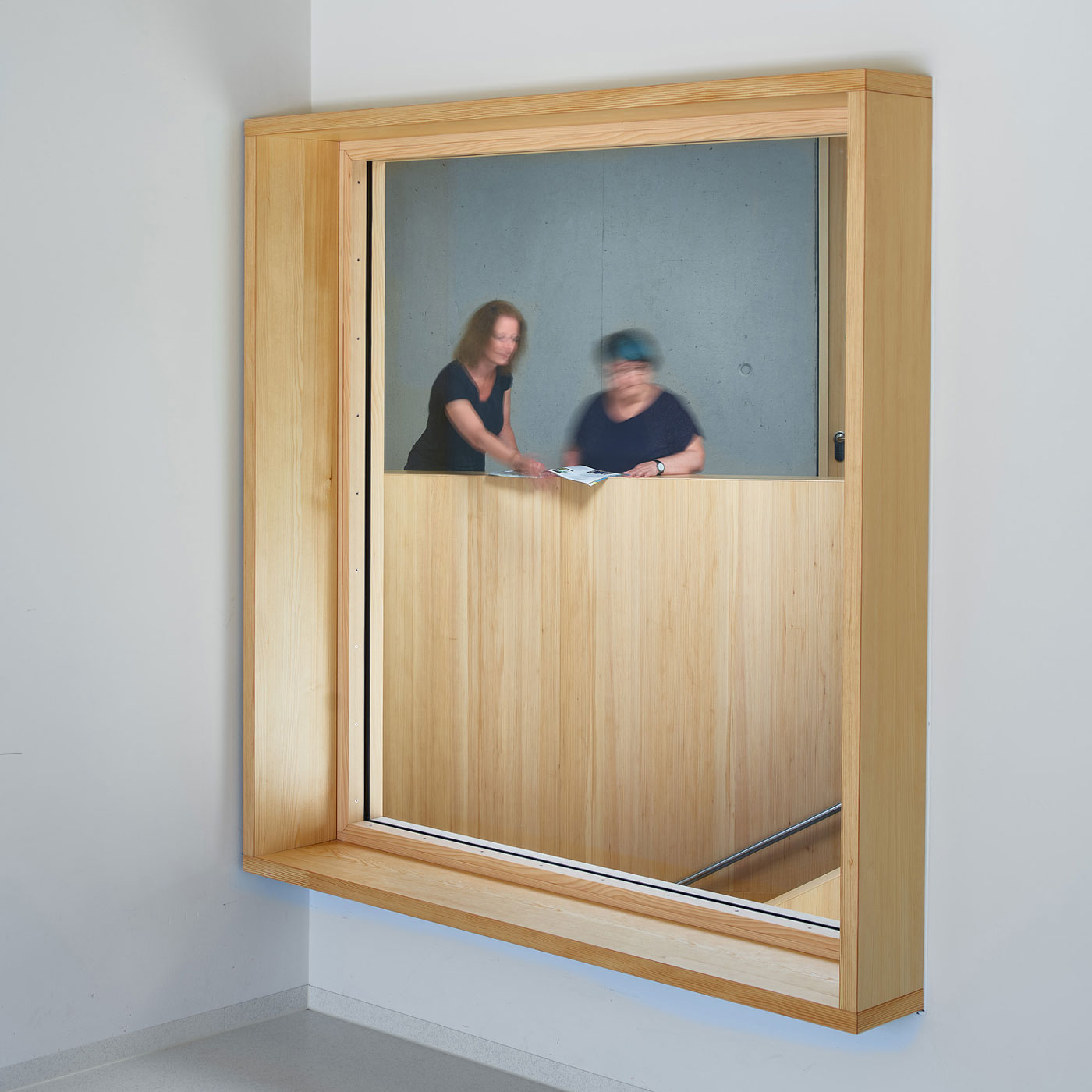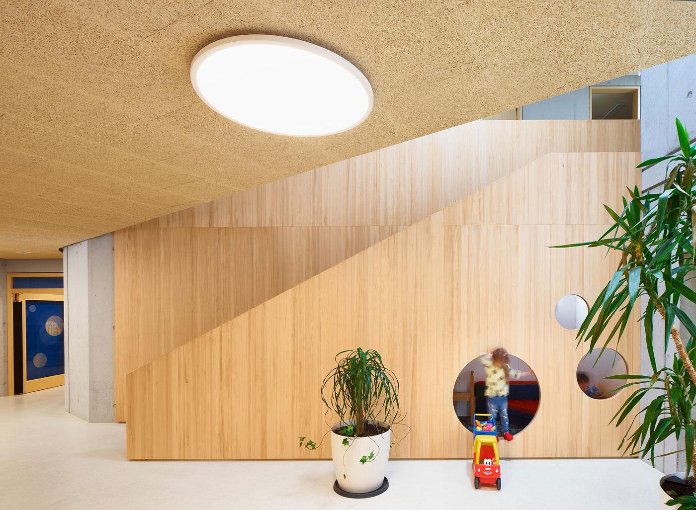 Barrierefrei und ebenerdig liegen die wesentlichen Funktionen Krippe, Kindergarten und der Wirtschaftsbereich im Erdgeschoss. Die stringente Anordnung der Gruppenräume ermöglicht die logische Verknüpfung von Stammgruppen und Funktionsräumen. Die Räumlichkeiten für Elterngespräche und die Sozialarbeit für Kinder mit Migrationshintergrund sind bewusst im Obergeschoss untergebracht. Diese werden von dem zentralen Marktplatz im Erdgeschoss aus erschlossen.